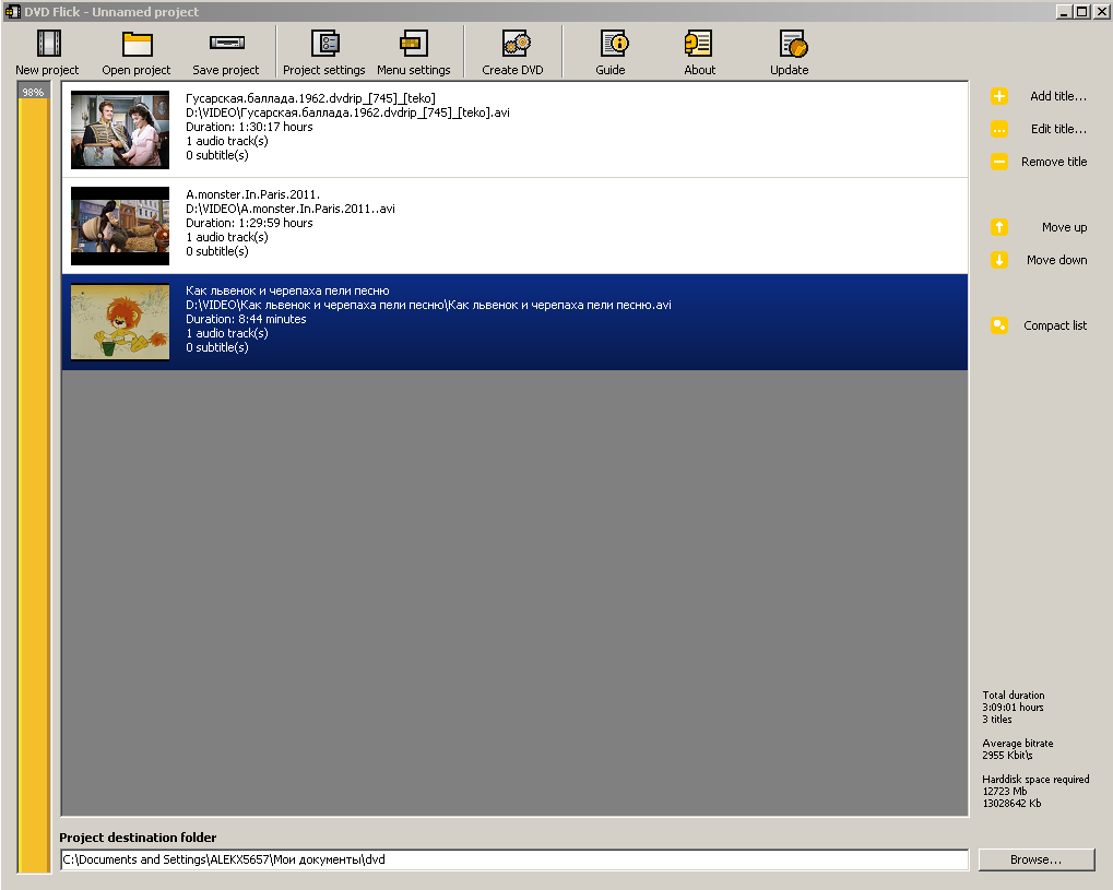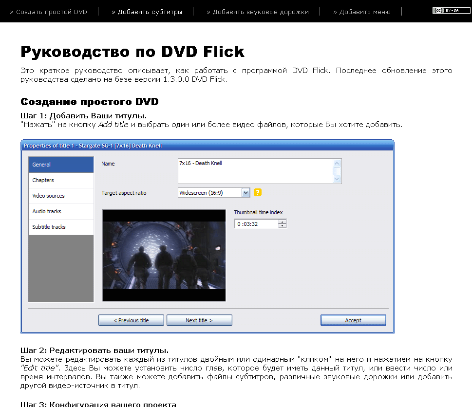 Скриншот![]() DVD Flick стремится быть простым, но в то же время мощным инструментом авторинга DVD. Mожет взять несколько видео файлов, хранящихся на вашем компьютере и превратить их в DVD, который будет воспроизводиться на вашем DVD-плеер, Media Center или домашнем кинотеатре. Вы можете добавить дополнительные пользовательские звуковые дорожки, субтитры, а также меню для упрощения навигации. Неоднократно использовал программу и только хорошие впечатления ,проста в эксплуатации ,понятное руководство и практически не зная английского языка я с удовольствием записываю DVD для всей семьи . Скачать программу можно Скачать с сайта проиводитедя или здесь по ссылкам . Подробнее про программу можно почитать здесь на сайте в разделе статьи ![]() ![]() | |